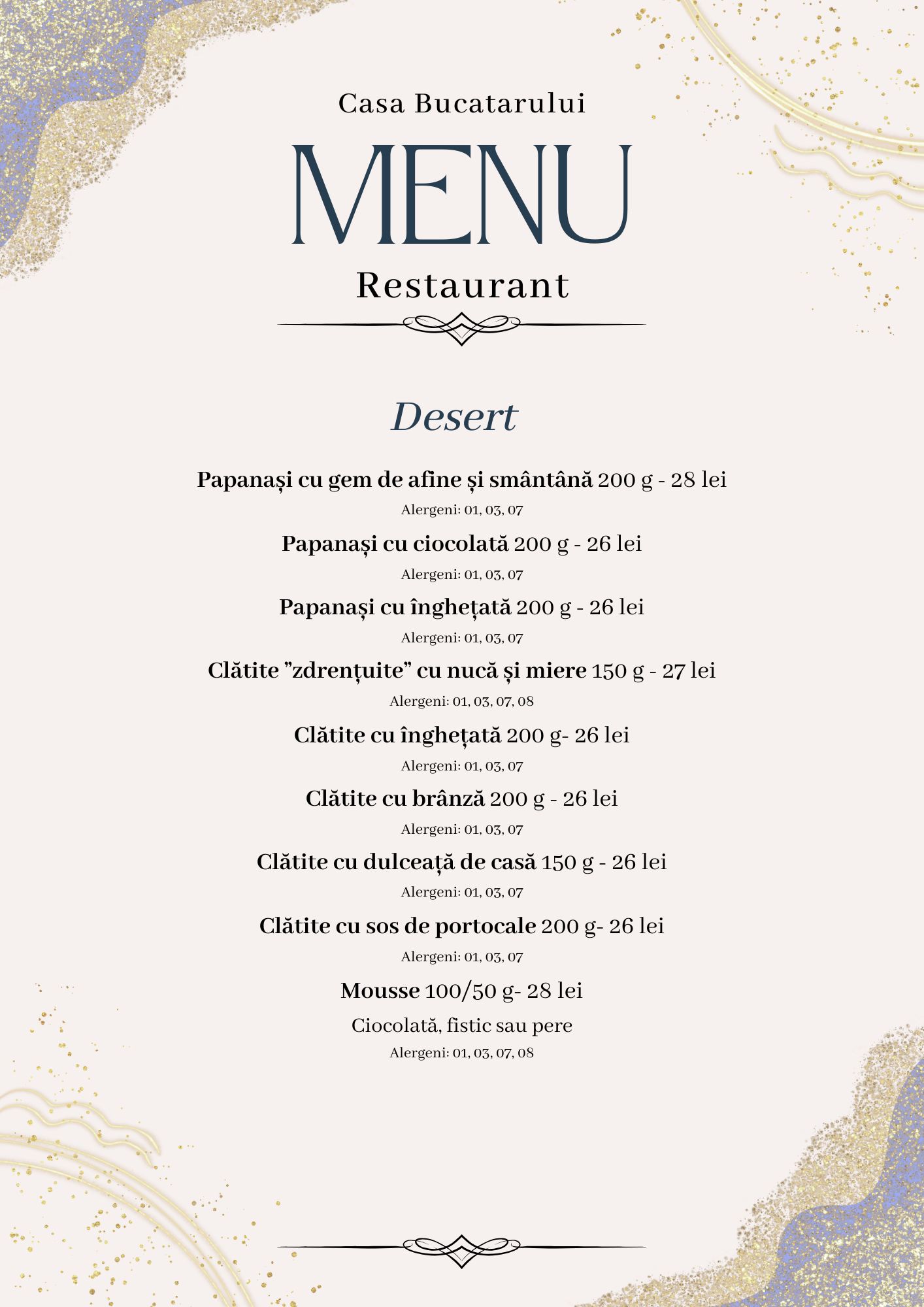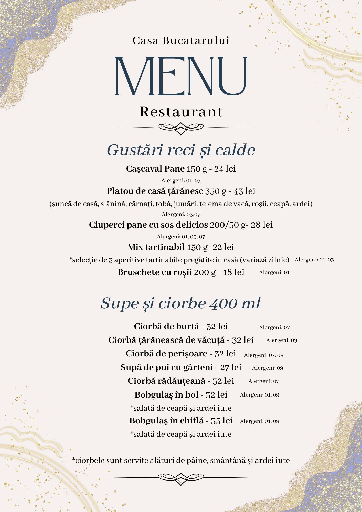 Ciorbele fierbinți, tocănițele aromate, plăcintele de casă și preparatele din carne fragedă se regăsesc alături de opțiuni mai ușoare sau internaționale, toate gătite proaspăt, cu respect pentru gust și pentru oaspeți.