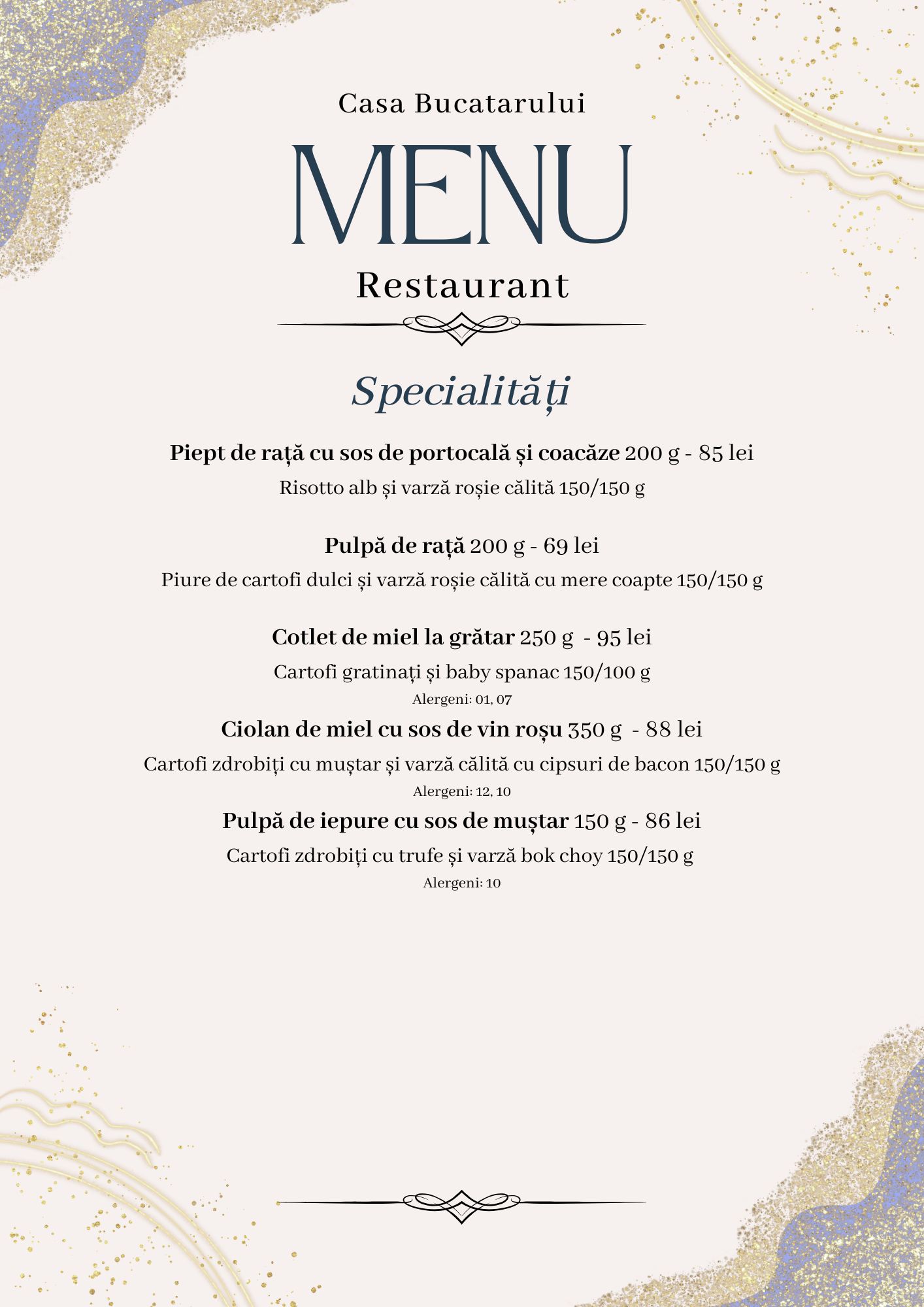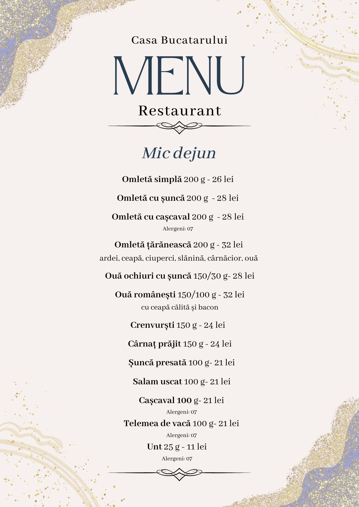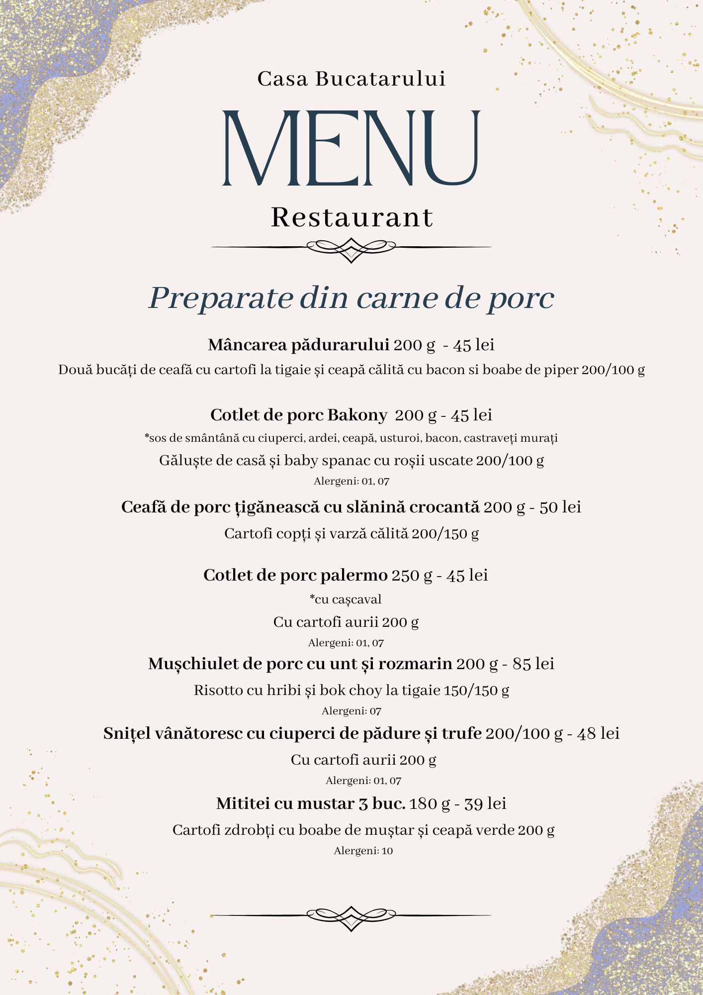 Meniul este inspirat din rețetele vechi, păstrate cu sfințenie din generație în generație, dar și din bucătăria occidentală, pentru a oferi o varietate care să mulțumească toți oaspeții. Folosim ingrediente locale și de sezon, iar fiecare fel de mâncare este pregătit ca acasă – simplu, gustos și cu mult suflet.