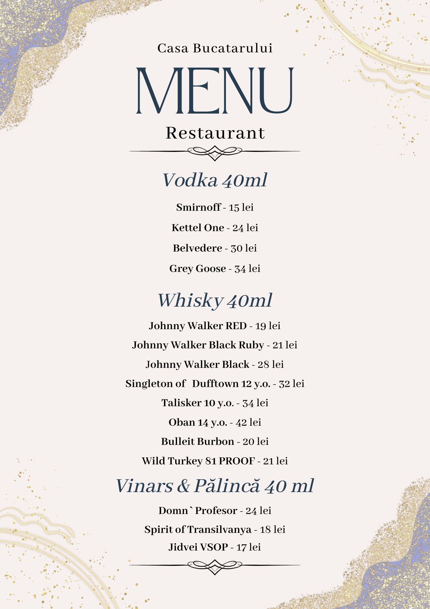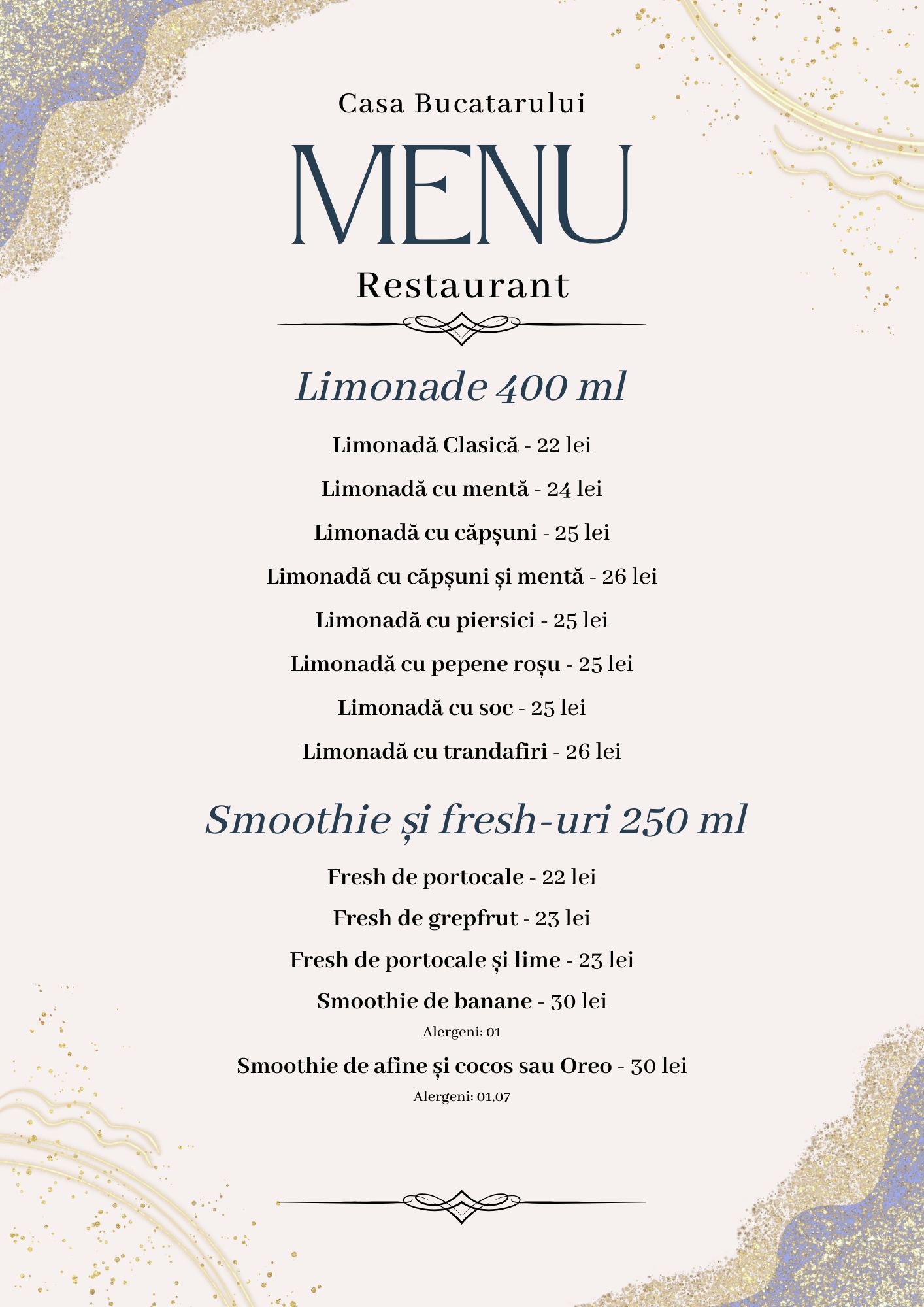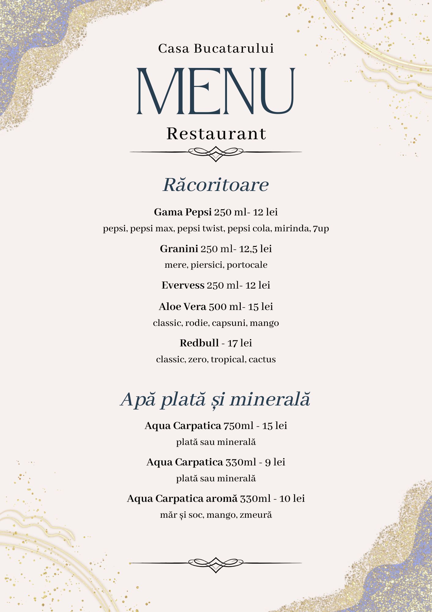 Pentru a completa experiența culinară, oferim o selecție de vinuri alese cu grijă – din podgorii românești și internaționale – și o gamă variată de băuturi: cocktailuri, sucuri naturale, limonade, smoothie-uri sau răcoritoare carbogazoase.