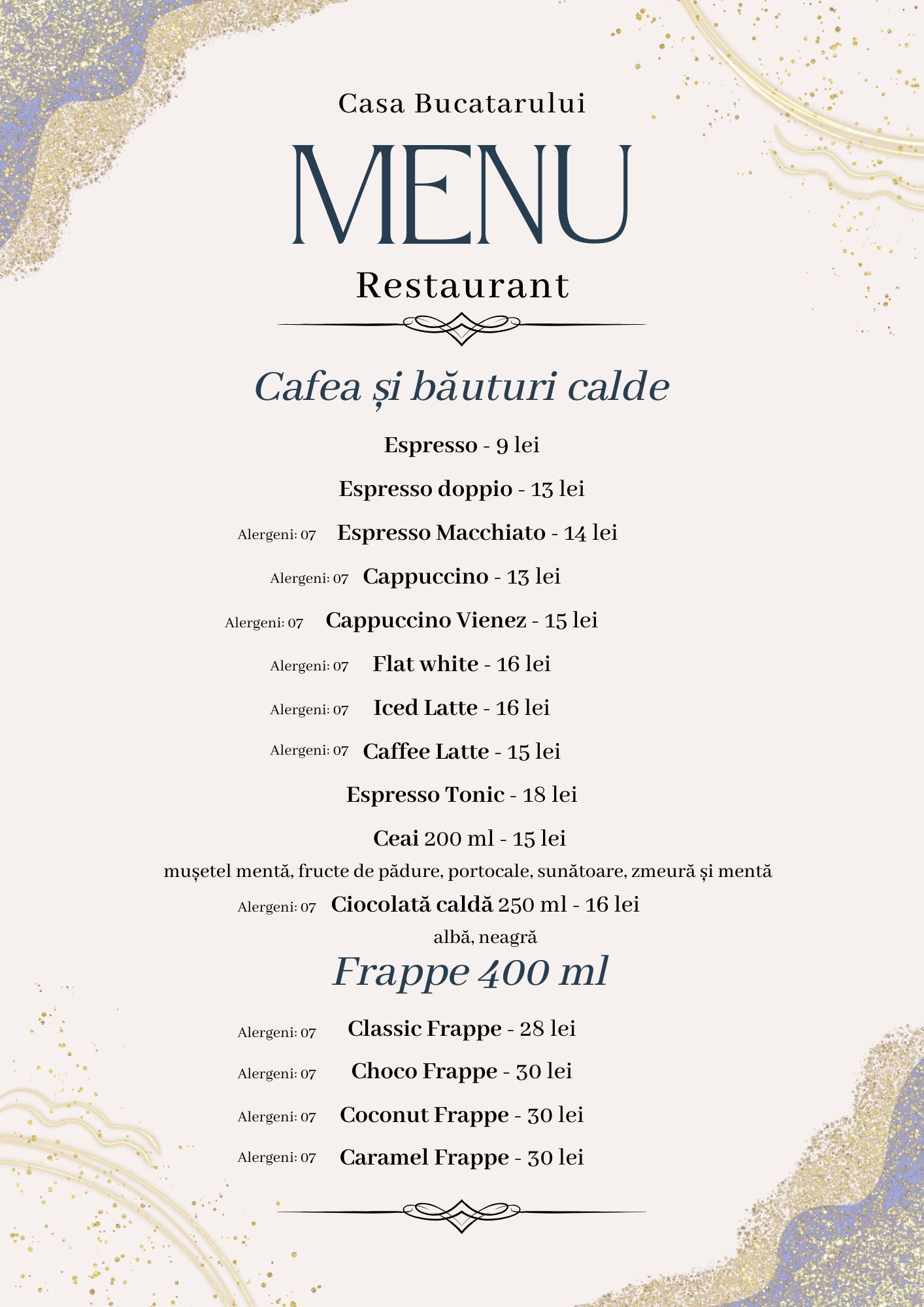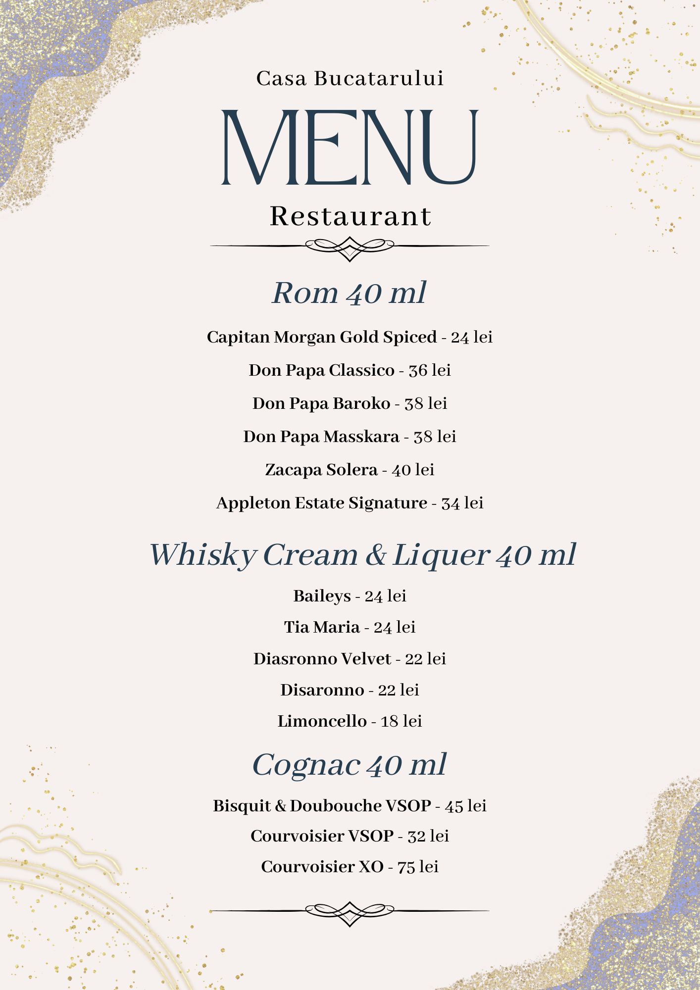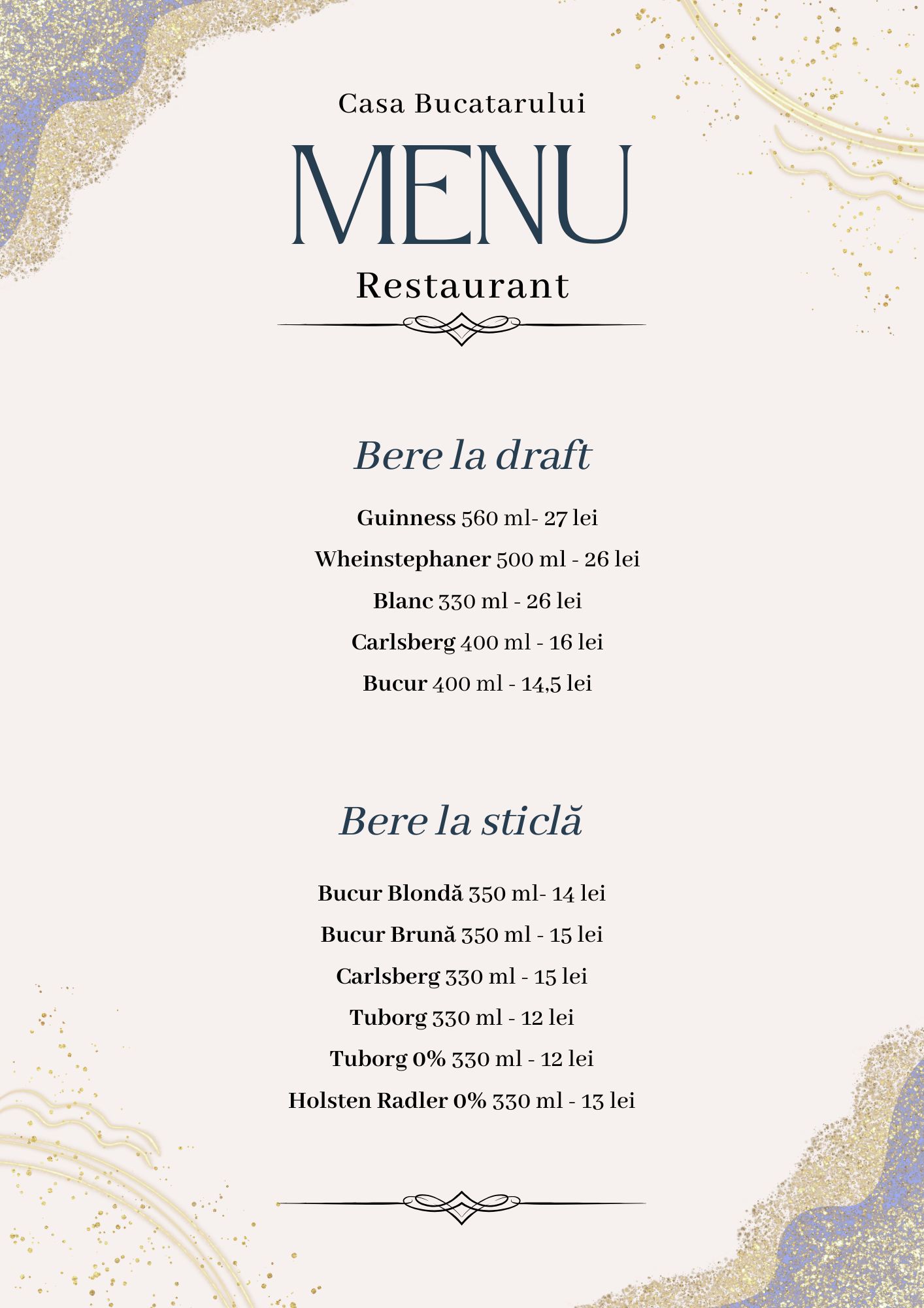Pentru a completa experiența culinară, oferim o selecție de vinuri alese cu grijă – din podgorii românești și internaționale – și o gamă variată de băuturi: cocktailuri, sucuri naturale, limonade, smoothie-uri sau răcoritoare carbogazoase.